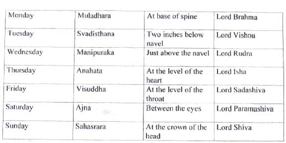 In our good-boy devotions, each day of the week a different aspect of Godhead Deity, corresponding to each of the seven major chakras, is prayed to. You might ask -- if there is only one God, are the Chakra Deities real? They're realer than we are, and considerably longer-lasting. This is a game that we play with the Godhead, that He apparently likes to play, and is willing to play. These are symbols, by which we contact him. Hare Bol.