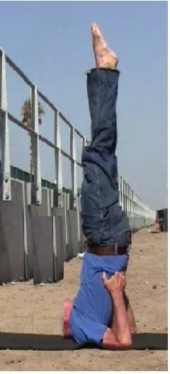 Support the back with the palms of your hands, elbows on the floor, and raise the legs and lower torso. Then straighten the body, raising the legs and pointing the toes toward the sky, as in the top photo. Stretch the body upward as far as you reasonably can, sort of bringing it to attention. This should be somewhat of a strain. With the toes still pointed upward, hold this pose for as long as you can. Then hold it some more. When you are ready to break it, hold it still a little more, gathering strength of will. Then relax down. I call this exercise ‘the will-builder’. Use it when you need to gather force behind your will, for accomplishment or conflict.