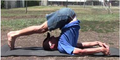 After stretching, sit on the ground or floor with your knees up, put the palms of your hands flat to the floor, fall back onto your elbows and continue rocking back while raising the hips and legs, supporting the lower back with the palms of your hands. Gradually straighten the legs and move the feet back over the head as though you were going to do plough pose (this is halasana -- see illustration below)